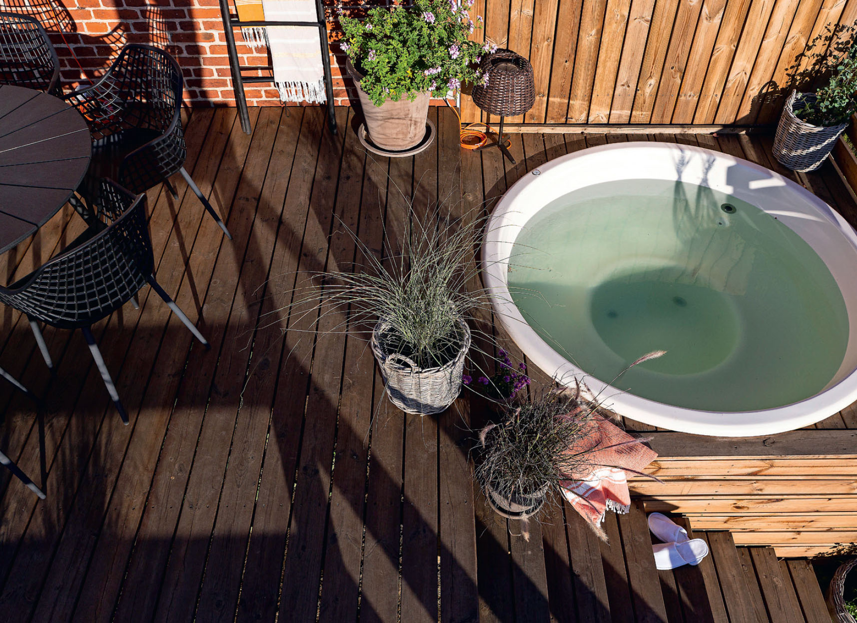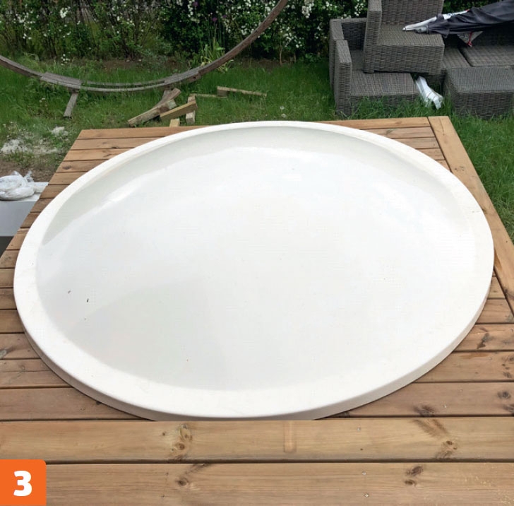 Når badestampen står solid på fundamentet, skal du forsikre deg om at den er helt i vater. Stampen kommer nemlig ikke til å hvile på terrassen, kun på fundamentet.