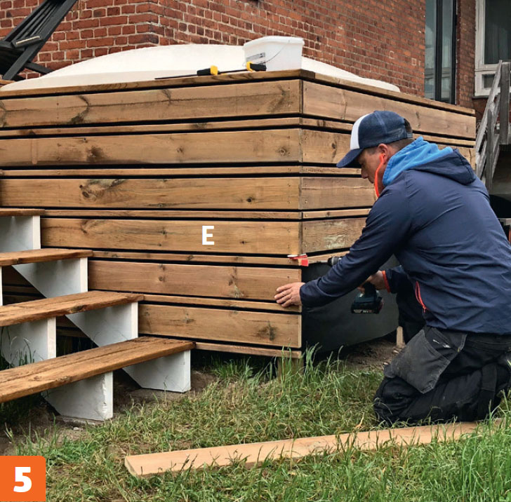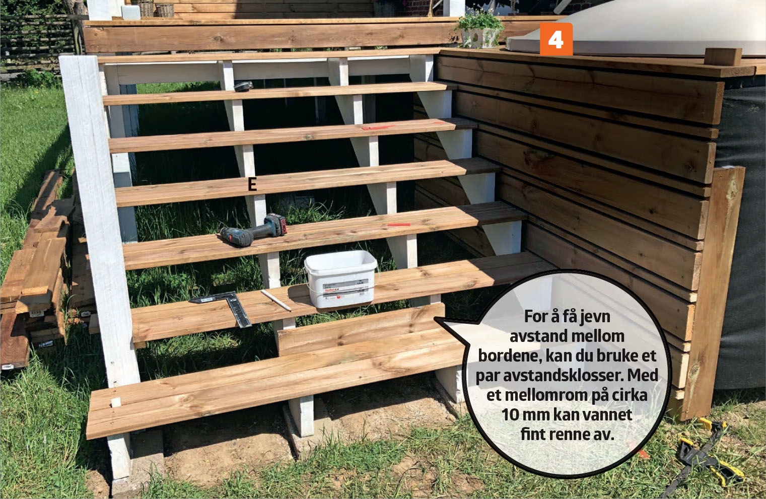 Konstruksjonen rundt badestampen kles med terrassebord (E). Ved å la hvert annet bord være en smal list skåret av et terrassebord, blir avslutningen ekstra flott.