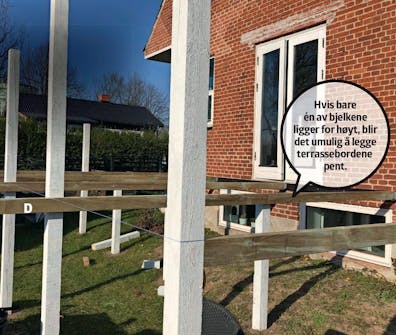 Når du plasserer det første bordet, skal det ligge vinkelrett på husveggen. På den måten blir det enklere å legge alle bordene helt rett. Når det første bordet ligger riktig, er det bare å fortsette. Vi bruker en blyant som avstandskloss mellom bordene. Det sikrer at regnet kan renne av, og at avstanden mellom de enkelte bordene er noenlunde lik. Vi lar dessuten de ytterste terrassebordene stikke et par cm utenfor sidesvillene for å gi gulvet en pen avslutning.