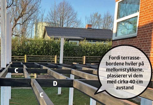 Ved å lage en liten mal, sikrer du at terrassebordene (E) kommer til å stikke like langt utenfor i sidene (C).