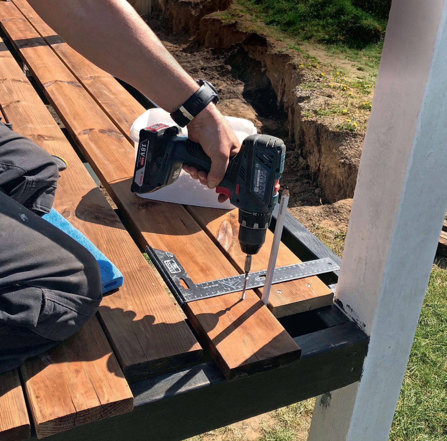 Når det første bordet er skrudd fast, og du har forsikret deg om at det ligger helt rett, kan de neste bordene skrus fast. Vi bruker en tømrerblyant som avstandskloss. Da vet vi at avstanden mellom bordene blir så jevn som mulig. Med en vinkel kan du markere avstanden mellom skruehullene og sikre at skruene flukter.