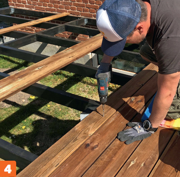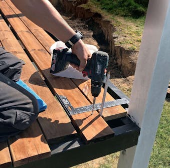 Deretter er det bare å montere resten av bordene med 5 x 60 mm terrasseskruer. Vi setter skruene i en vinkel på 90 grader og husker å bruke blyanten som avstandskloss hver gang.