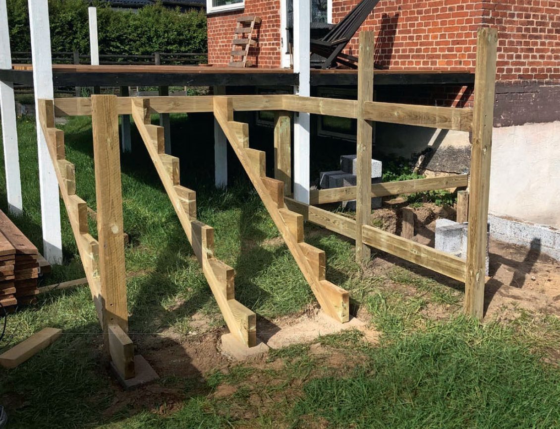 Ved å klosse opp trappevangene på tre betongheller, får de en større trykk flate mot underlaget, og vi unngår at det trenger opp fukt fra bakken i vangene. Etter at de er klos set opp, festes den øverste delen av vangene, før vi bygger skjelettet som badestampen skal stå i. Vi kan dog ikke montere trappetrinn og side kledning på skjelettet før stampen er koblet til og klar til bruk.