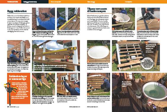 Terrassebordene festes til konstruksjonen, slik at de fortsetter under kanten på badestampen. Ved å montere noen ekstra skråstivere rundt stampen, får du noe å skru fast bordene i.