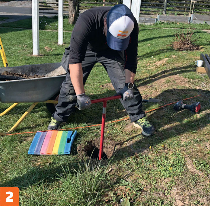 Bor hull til stolpen med et jordbor, og sjekk at du kommer til det som anses for å være frostfri dybde hos deg. Bruk eventuelt en teip på boret for markere dybden.