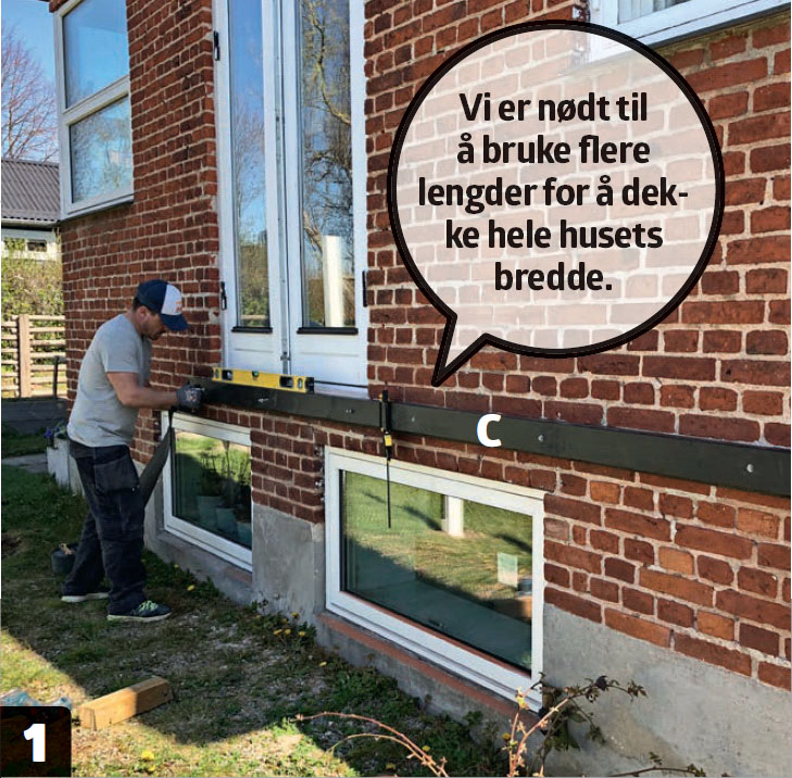 Avsett ønsket høyde, og bor et hull for hver halve meter gjennom svillen (C) og inn i veggen. Monter deretter svillen med 10 x 180 mm franske treskruer med spenn skive - eventuelt med en slagtrekker.