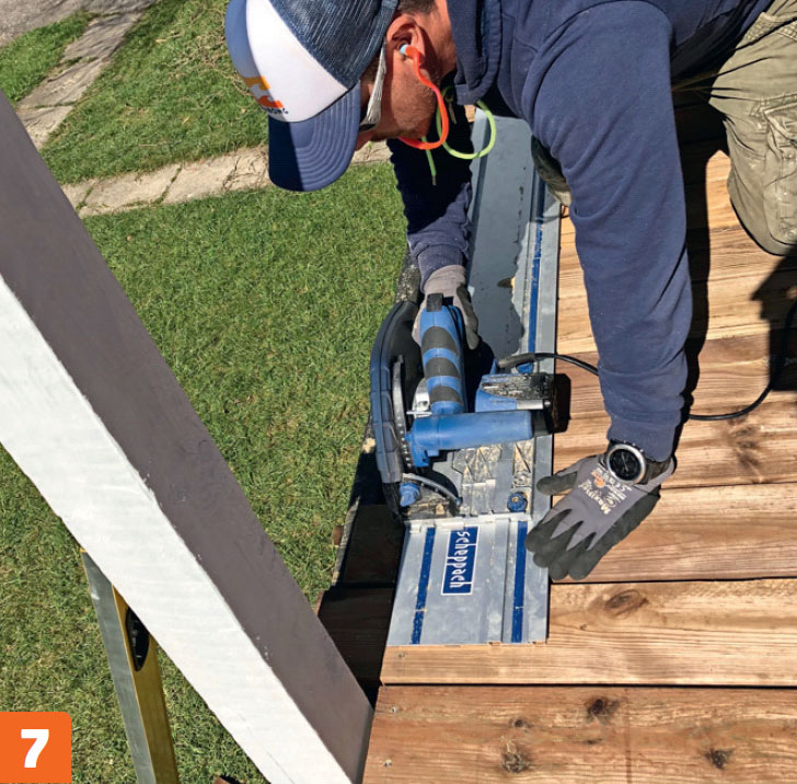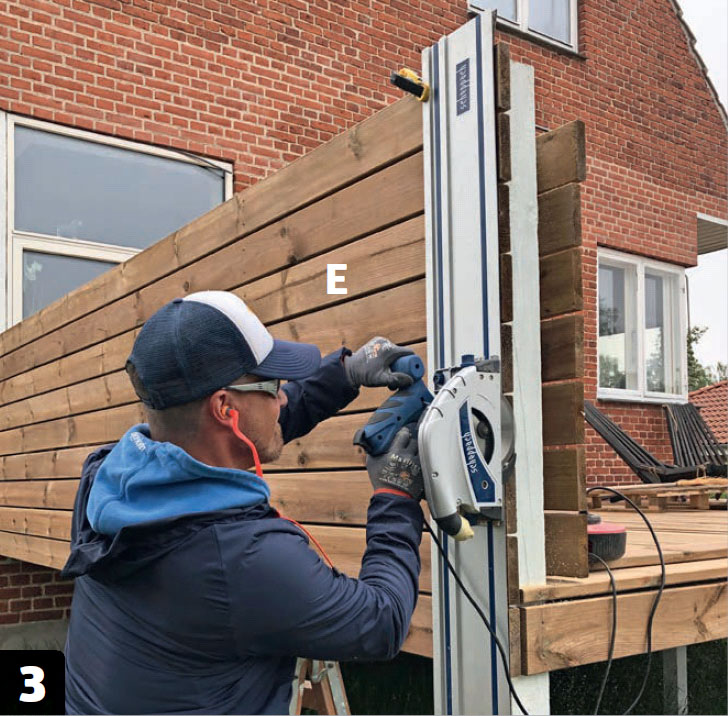 Skjær til kledningen (E) på endeveggen med en dykksag, slik at den flukter med endebordet på terrassen. Føringsskinnen er holdt fast med tvinger, slik at den ikke flytter seg mens det sages.