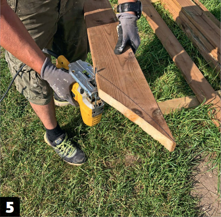 Skråskjær kledningen til trapperekkverket med en stikksag, slik at det passer med de vannrette bordene. Ved å vende sagen er det lettere å se hvor du sager, og snittet blir som regel mindre oppfliset.