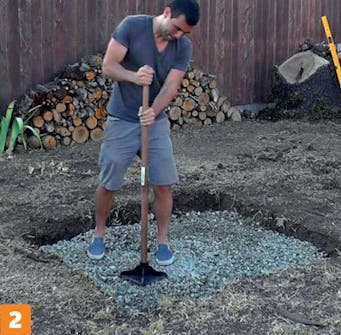 Hagesingel fylles i hullet. Jevn først underlaget så godt du kan, og fordel et drøyt 10 cm tykt lag singel. Singelen skal også stampes, så den blir så kompakt som mulig.