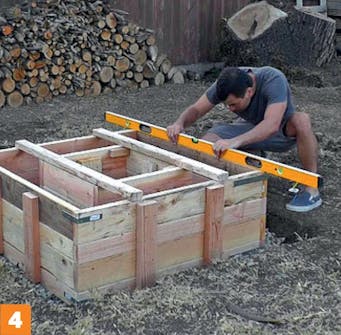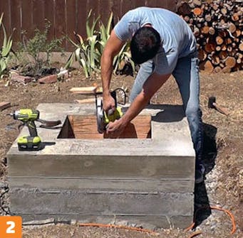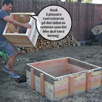 Når du har bestemt deg for hvor stort bålstedet ditt skal være, kan du lage en støpeform. Her består den av to rammer laget av forskalingsbord - fire til hver side av både den store ytre, og den mindre indre rammen. De har lik høyde, så overflaten blir helt rett.