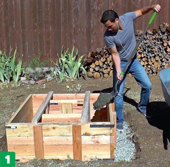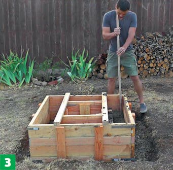 Plasser støpeformen der du ønsker å ha bålstedet, og lag merker på bakken litt utenfor rammen, slik at du vet hvor du skal grave. Fjern rammen, og grav et hull som er cirka 20 centimeter dypt.