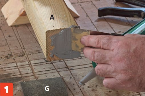 Bunnen på hjørnestolpene (A) forsegles etter at de er kappet. Endetreet mot bakken lukkes med murpapp (G), som limes på med lim/fugemasse, og skjæres til så de passer med stolpene. Stolpene males.