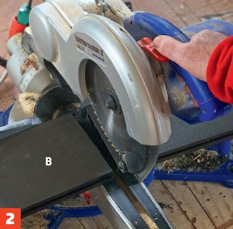 Bordene (B og C) skjæres ut. De kan skjæres med håndsag, men snittene blir rene og nøyaktige i kappsagen. Lag lengdestopp, og kapp alle seks langsider (B) på 120 cm og seks kortsider (C) på 80 cm.
