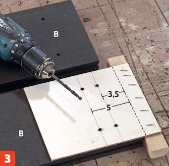 Forbor til skruer på bordene (B og C). For å få skruene i snorrette rekker midt på hjørnestolpen, lager vi en boremal. Fletteteknikken gjør at skruene settes i forskjellig avstand i hver ende av plankene.