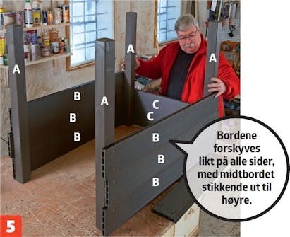 Vi setter sammen bordene (B) til langsidene med 5 x 50 mm rustfrie skruer. De flettes, så hvert annet bord flukter med hhv. stolpesiden eller stikker ut en planketykkelse - her 25 mm - fra stolpekanten.
