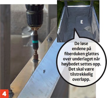 Fiberduken (E) stiftes fast på stolper og sider. Den skjæres til i biter, slik at den får en liten bøy opp på stolpene og rekker innover bunnen. Duken settes så den stikker 4-5 cm over den øverste plankekanten.