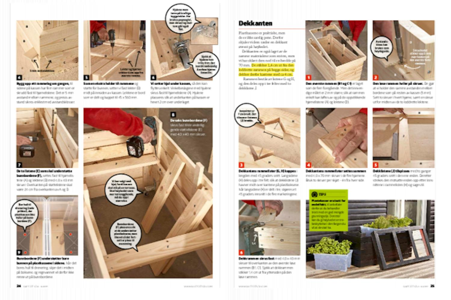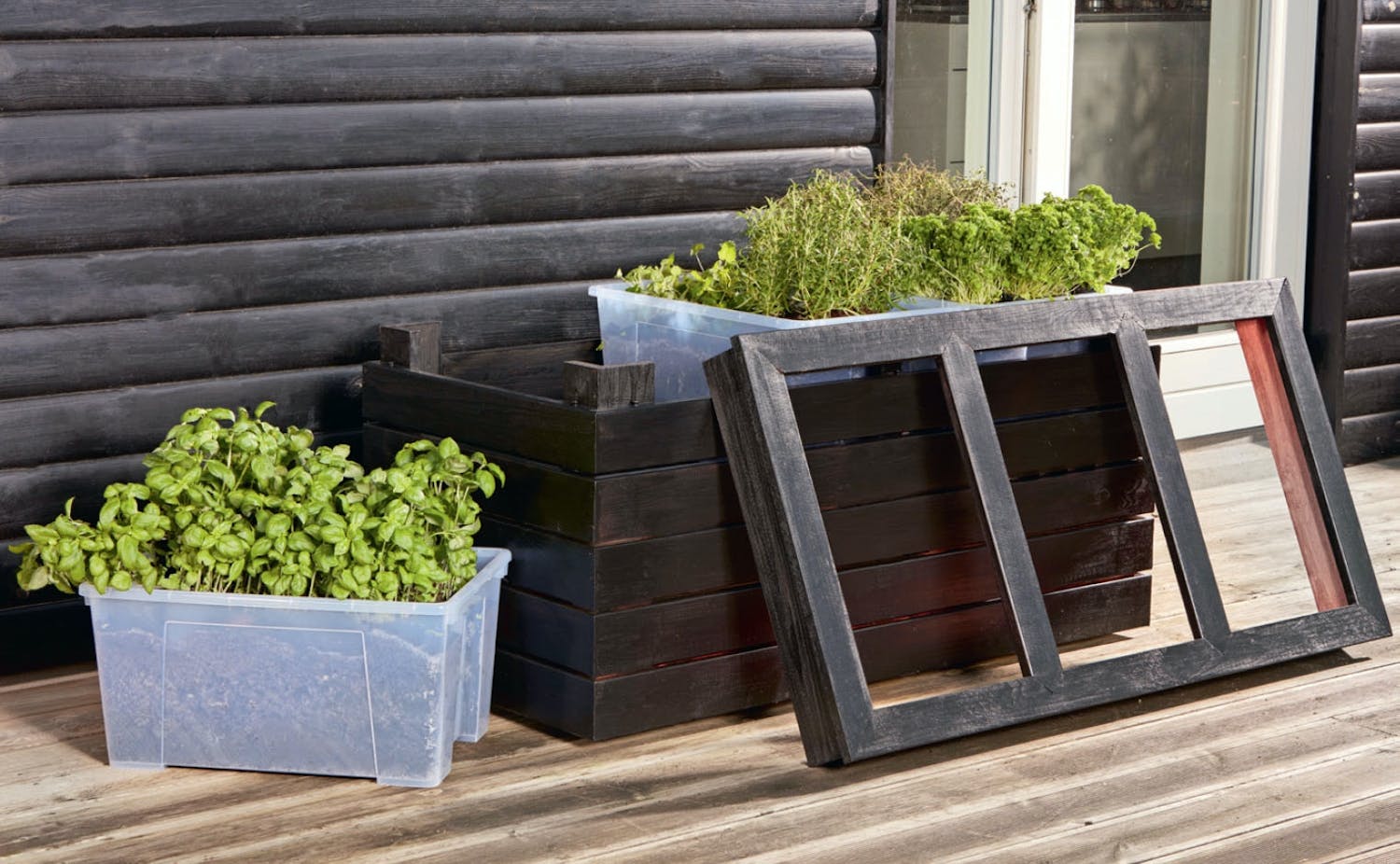 Plastkassene er praktiske, men de er ikke særlig pene. Derfor skjuler vi dem under en dekkant øverst på plantekassen.