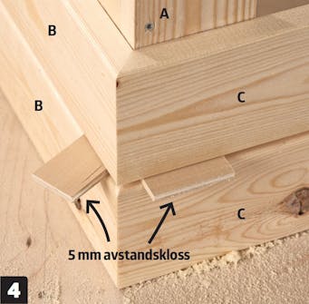 Bygg opp ett rammelag om gangen, til sidene på kassen har fem rammer som er skrudd fast til hjørnelistene. Det er 5 mm avstand mellom rammene, og presis avstand sikres enklest med avstandsklosser.