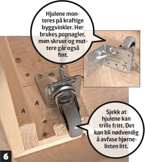 Vi setter hjul under kassen, så den kan flyttes enkelt. Vinkelbeslagene med hjulene skrus fast til hjørnelistene (A). Hjulene plasseres slik at underkanten på kassen er hevet 2 cm over underlaget.