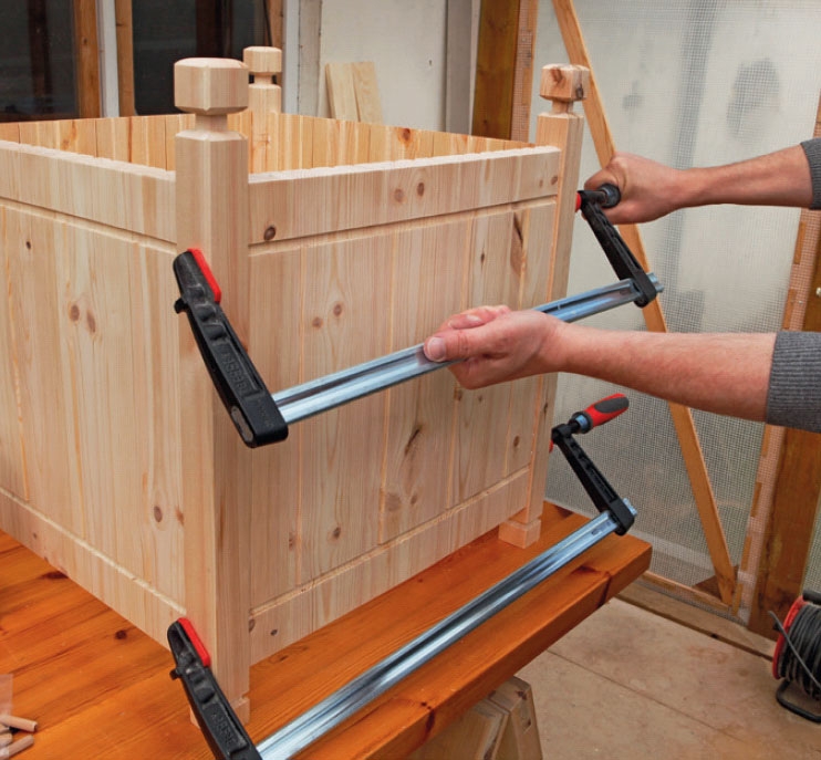Sidene (B) settes sammen som limtre av gulvbord. Du kan også bruke andre materialer, bare tre og lim tåler å stå ute. Som limtvinger bruker vi trekiler (K), som spennes mot fastskrudde klosser (L) i en “limkasse”. Listen (M) holder bordene nede.