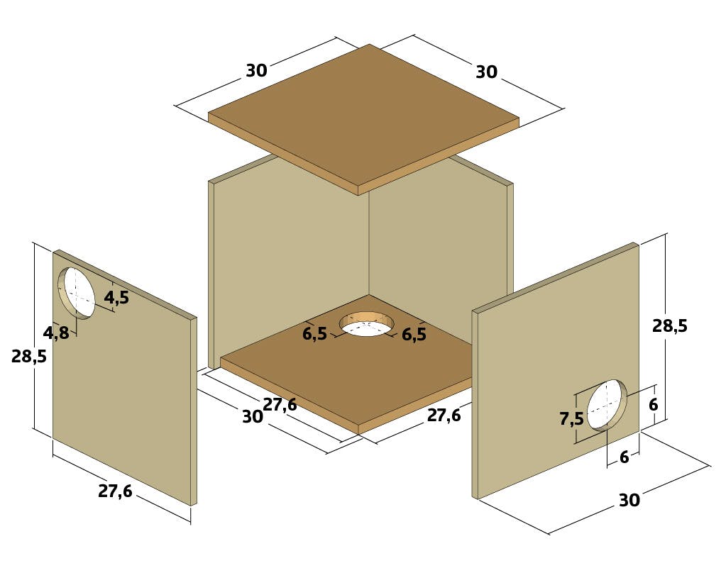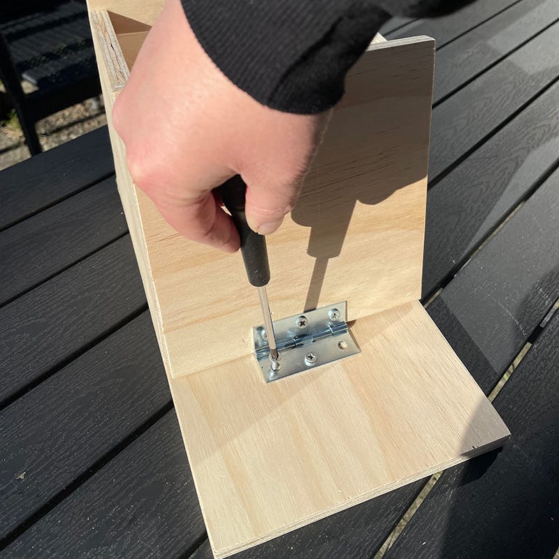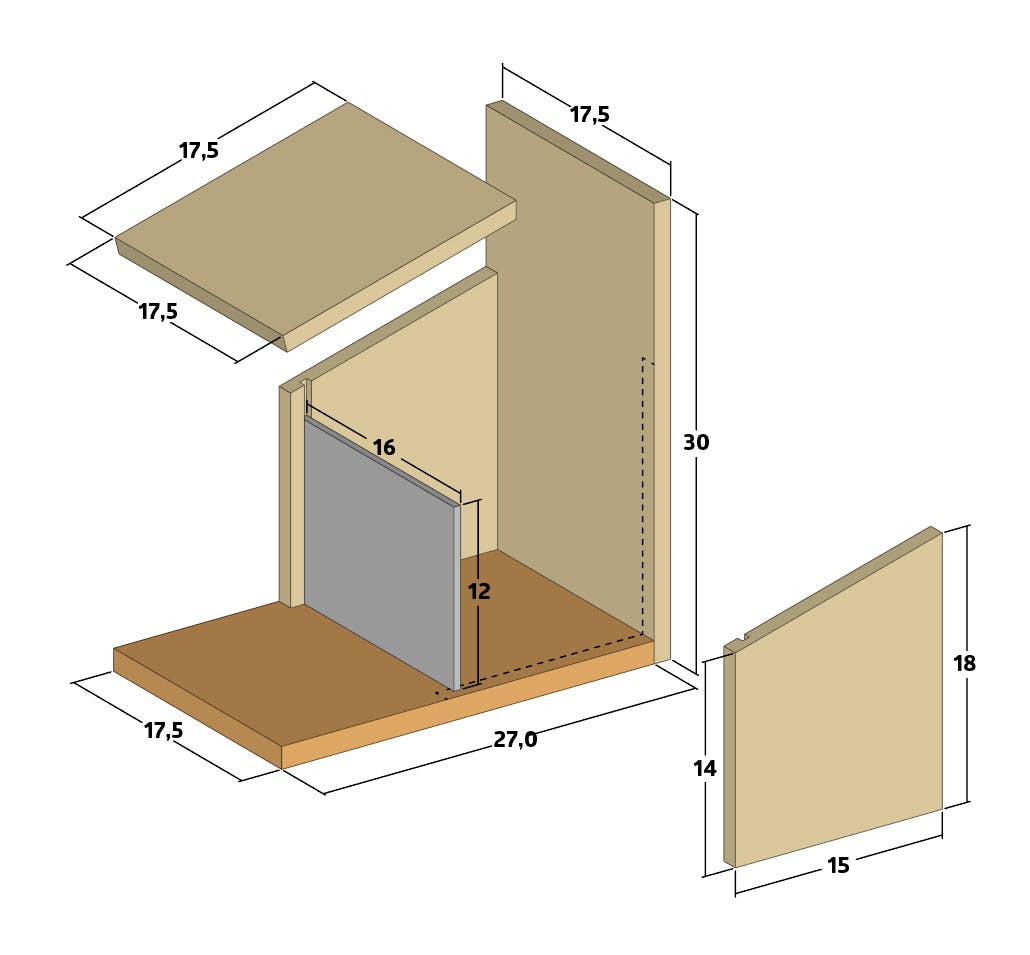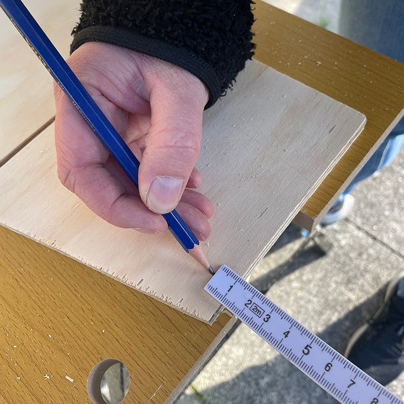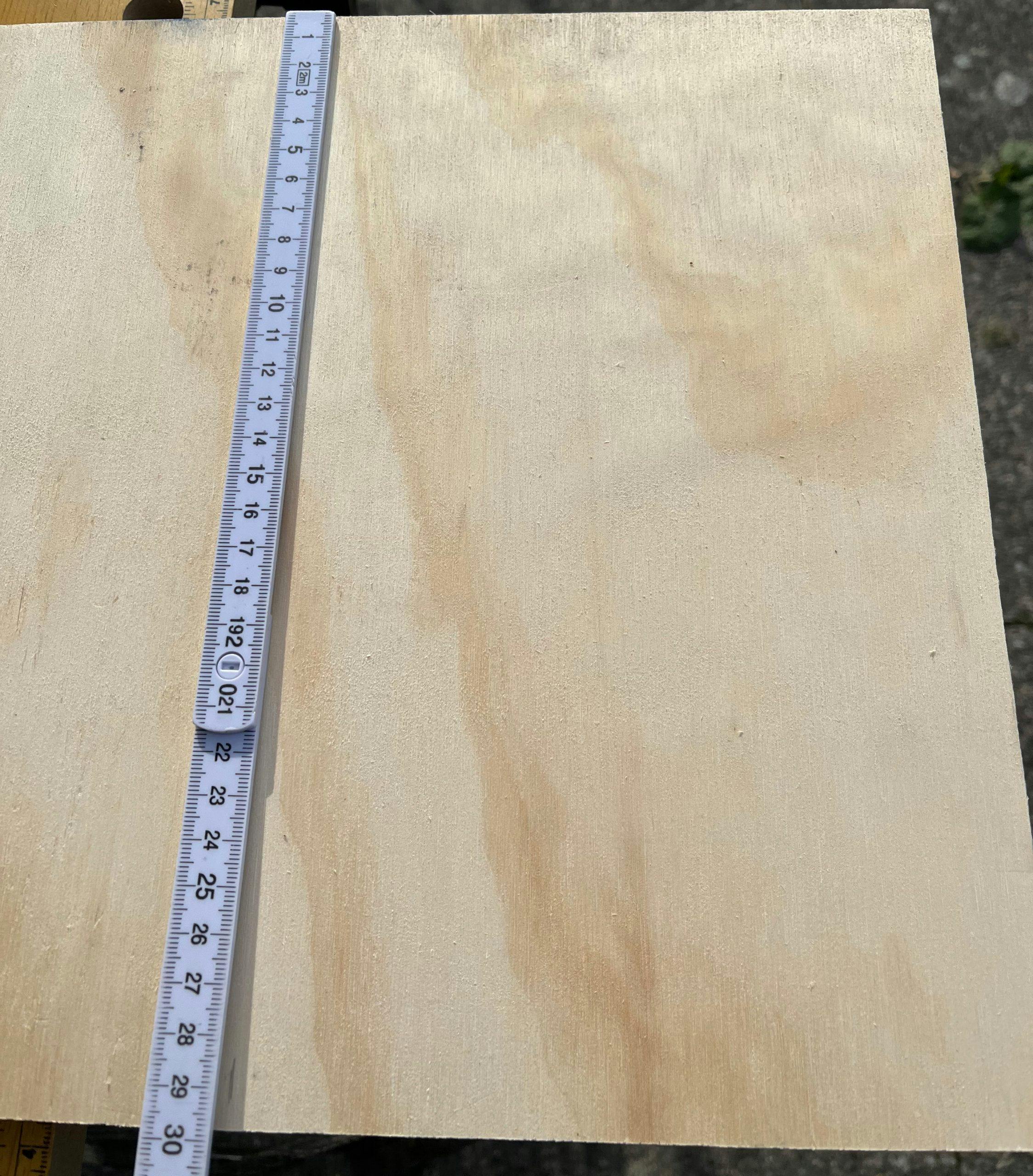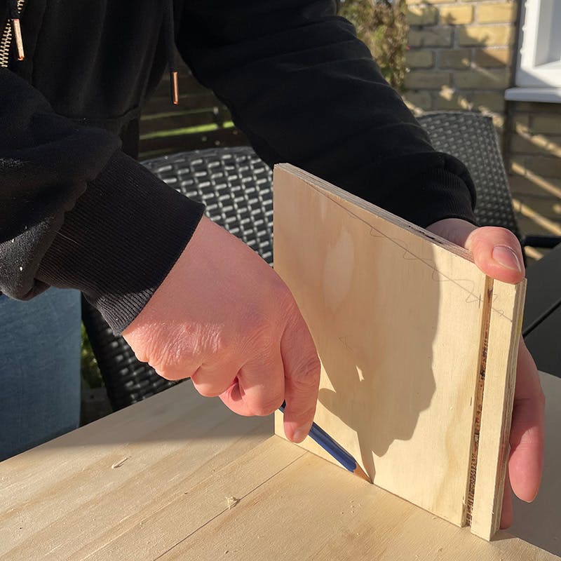 Start med å markere på kryssfinerplaten hvor du skal sage. Du skal markere en bakplate, en bunnplate, to sider og et lokk.