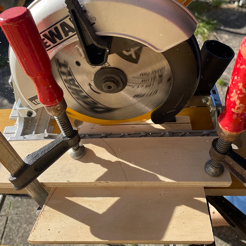 For å kutte lokket slik at det passer til bakplaten, stiller vi inn vinkelen på sirkelsagen på 15 grader og sager forsiktig.