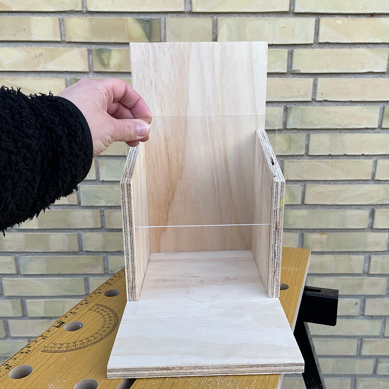 Sag pleksiglasset på riktig mål. Det skal ikke være like høyt som sidestykkene, fordi det må være luftrom opp til lokket. Her har vi laget det 16 cm x 12 cm.