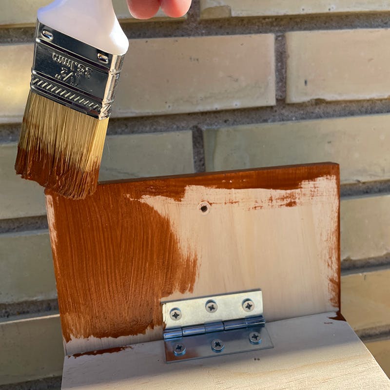 Du kan male ekornmateren med en trebeskyttelse. Vi bruker vannbasert trebeskyttelse her, så den kan vi male innsiden også med.