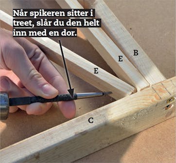 Buelistene (E) spikres sammen i kryssene med 1,6 x 25 mm spiker. Forbor gjerne med et 1 mm bor for å unngå at det spinkle treet sprekker - om ikke nå, så senere, hvis spikeren har svekket det.