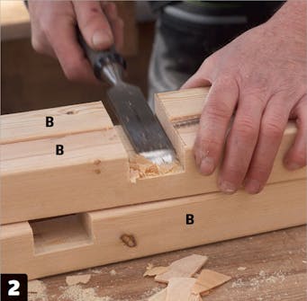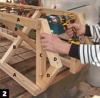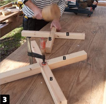 Støttekryssene (B) settes sammen. Legg først lim i hakkene, og sett sammen kryssene. De bankes forsiktig på plass og holdes i spenn med en tvinge til limet er tørt. Er de litt løse, må de også skrus sammen.