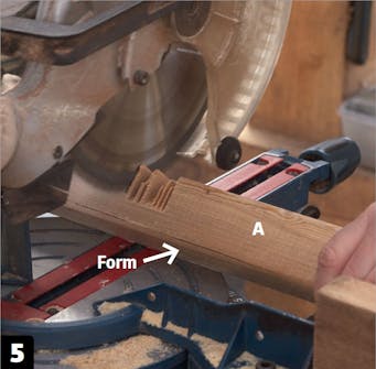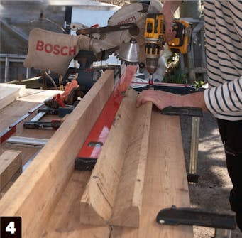 Bygg en “form” med to trekantlister som festes slik at stolpene til hagetårnet kan plasseres med den spisse kanten av stolpen opp. Her skal det lages trekantede hakk i stolpene som kryssene skal festes til.