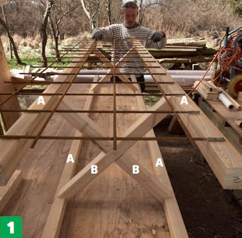 Taket består av kryssfinérplater som kles med takshingel, og sperrene lages av splittet 48 x 98 mm - samme dimensjon som stolpene. Vinkelen på taket er 30 grader, og den tegnes opp på bordet, slik at det er enkelt å lage sperrene med riktig helling.