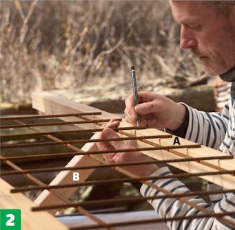 Mål opp til armeringsnettet som skal kle tre av hagetårnets sider. Plasser nettet på siden, og sentrer det mellom stolpene (A). Nettet skal ligge cirka 2,5 cm inn på stolpene. Det klippes til med en boltsaks.