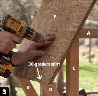 Skru fast to platestykker (F) til sperrene. Platene består av vannfast kryssfinér og er 45 x 60 cm. De er kappet med et 30 graders snitt i mønet og skrus fast med 4,8 x 75 mm skruer.