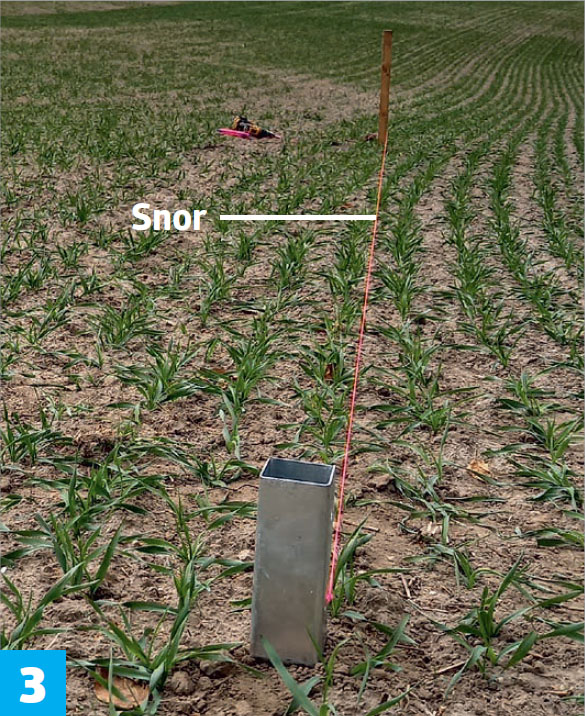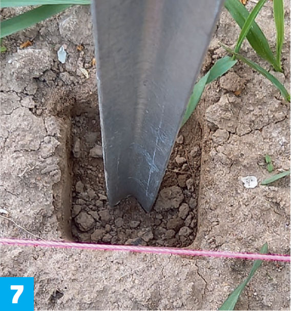 For å få riktig avstand mellom stolpene snus spydet på hodet. Toppen av spydet, som nå vender ned, støtes helt inn mot avstandspinnen og plasseres langs snoren. Slå deretter et par ganger på spissen av spydet for å lage en markering i bakken.