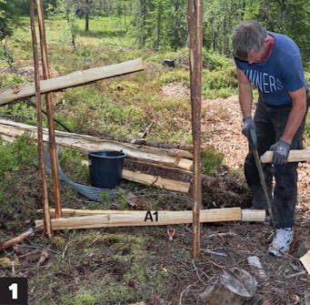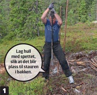 Begynn med å lage hull til det første staurparet med et spett. Staurene skal stå parvis, med cirka en knyttneves avstand.