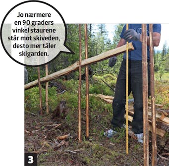 Første og siste staurpar skal stå helt loddrett. Resten heller svakt mot skiveden. Settes staurene med omtrent 90 graders vinkel mot skiveden, tåler skigarden større belastning fra for eksempel snø.