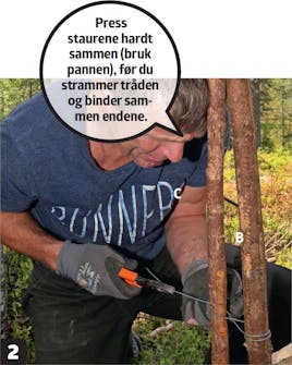 Slik binder du. Bind ståltråden to runder rundt den bakerste stauren (C), kryss tråden mellom staurene, og vri den rundt den fremste stauren (B). Stram til, og vri endene sammen før du klipper dem av.