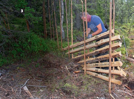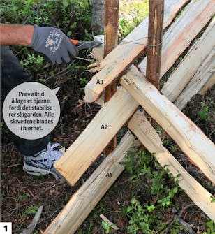Første skived (A1) legges på. Kapp den til, så den passer mellom de første to staurene, pluss et passe overskudd, som stikker ut i enden. Den øverste enden av skiveden løftes med litt ståltråd.