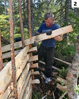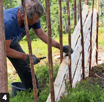 De lange skivedene klemmes fast mellom staurparet, som deretter bindes stramt sammen.