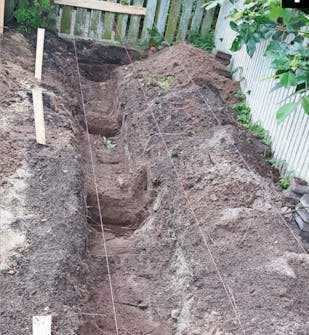 Grav ut til stolpene. Her er det først fjernet en hekk, og murersnorene markerer hvor gjerdet skal være. Stolpene skal plasseres med en avstand på 166 cm. Hullene er cirka 90 cm dype.