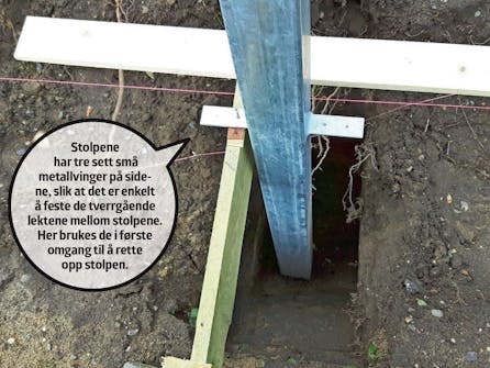 Det monteres tre lekter mellom hvert sett stolper, i første omgang øverst og i midten. Nederst støttes stolpene fortsatt slik at de står i lodd.