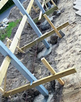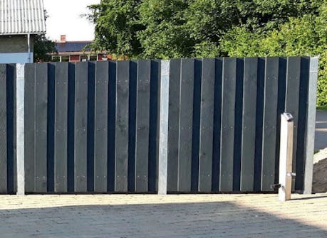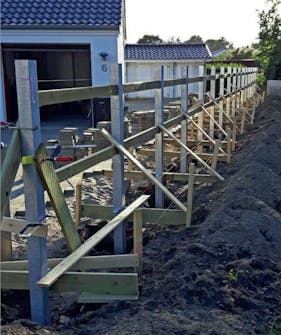 Dette gjerdet er 28 meter langt, og det er i alt 17 stolper som skal støpes fast i betong. Stolpene støttes midlertidig opp i en ukes tid før betongen er tørr nok til at kledningsbordene kan monteres.