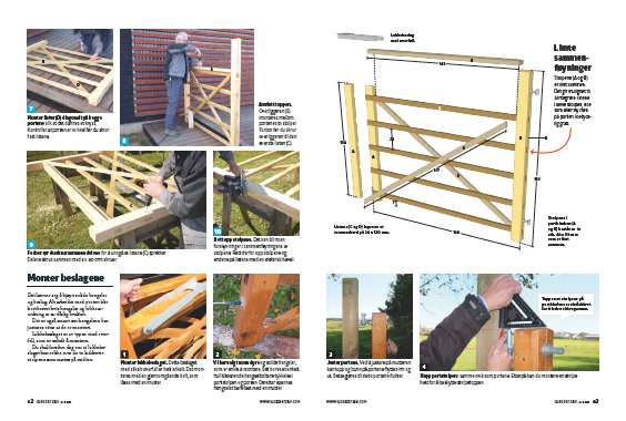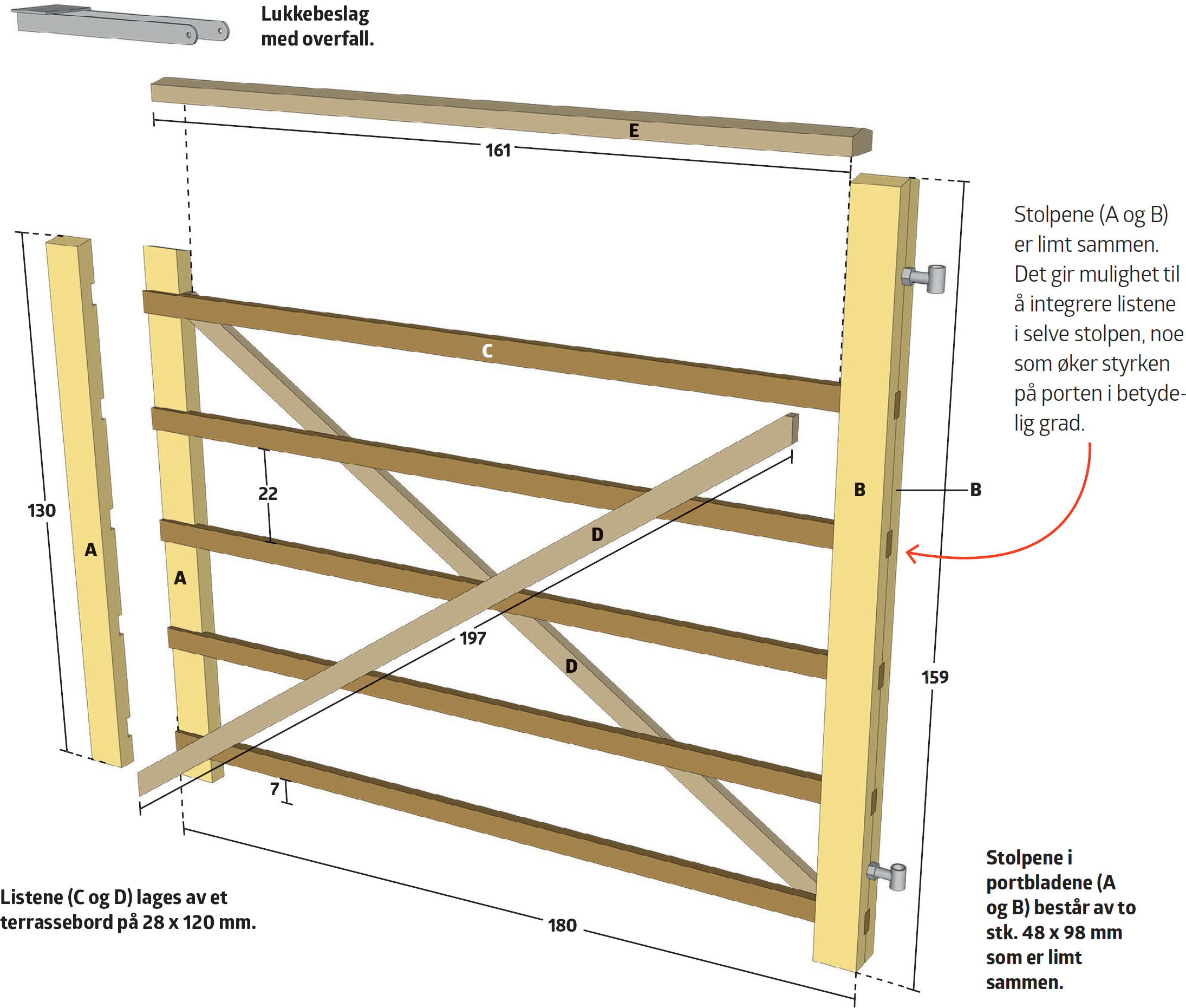 Hver stolpe i portbladene er laget av to stk 48 x 98 mm som er limt sammen. Det felles inn tverrgående lister i stolpene, for å gjøre porten sterkest mulig.