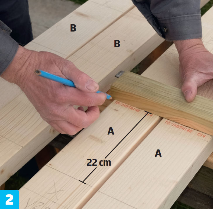Legg stolpedelene (A + B) ved siden av hverandre, og strek opp til alle de tverrgående listene (C) i én omgang. Den nederste listen plasseres 7 cm fra bunnen.
