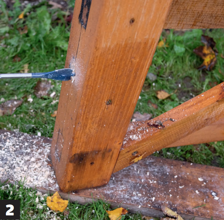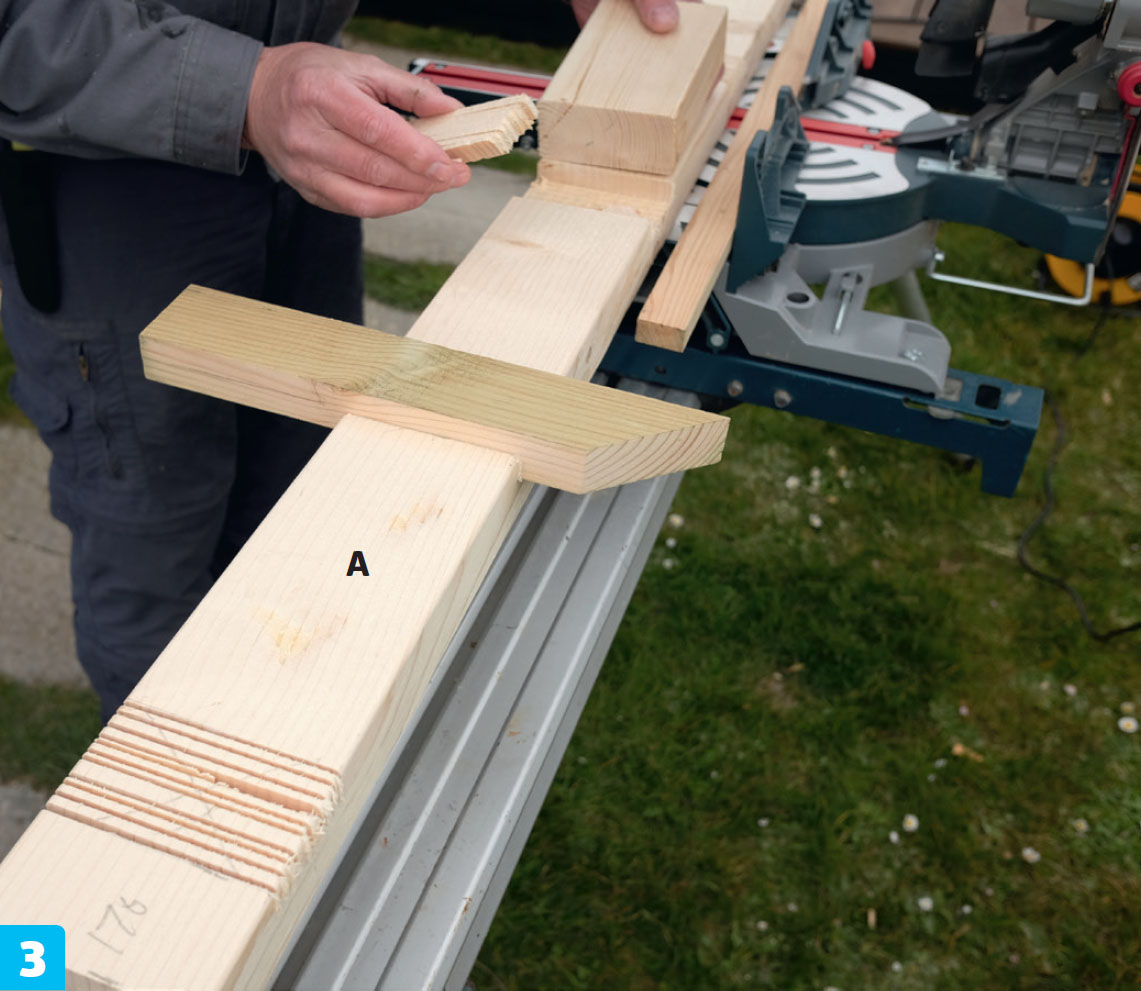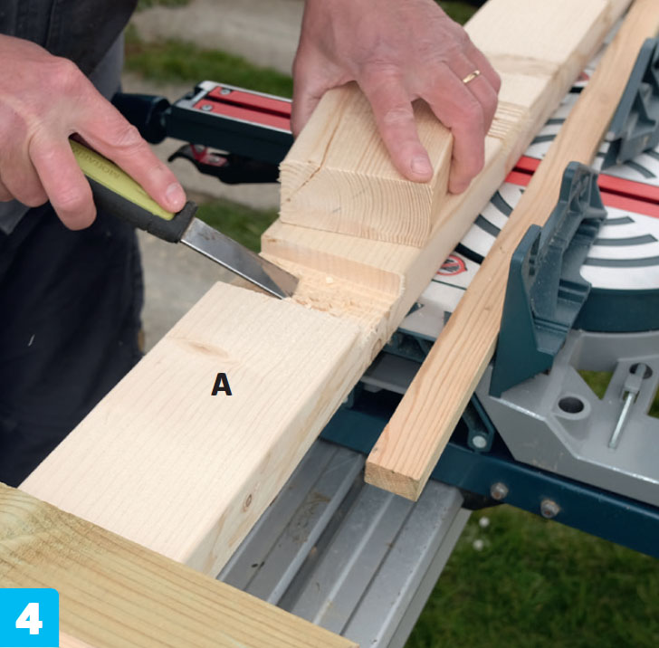 Det lages hakk til de tverrgående listene i begge stolpedelene, før de limes sammen.