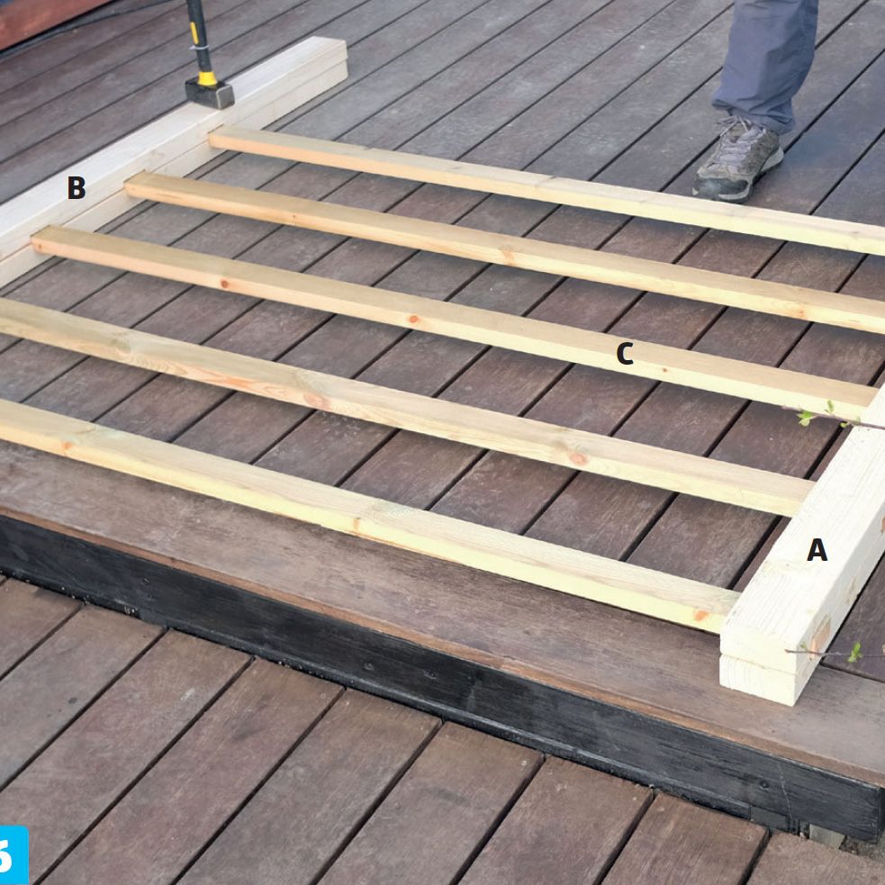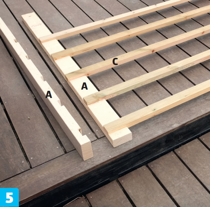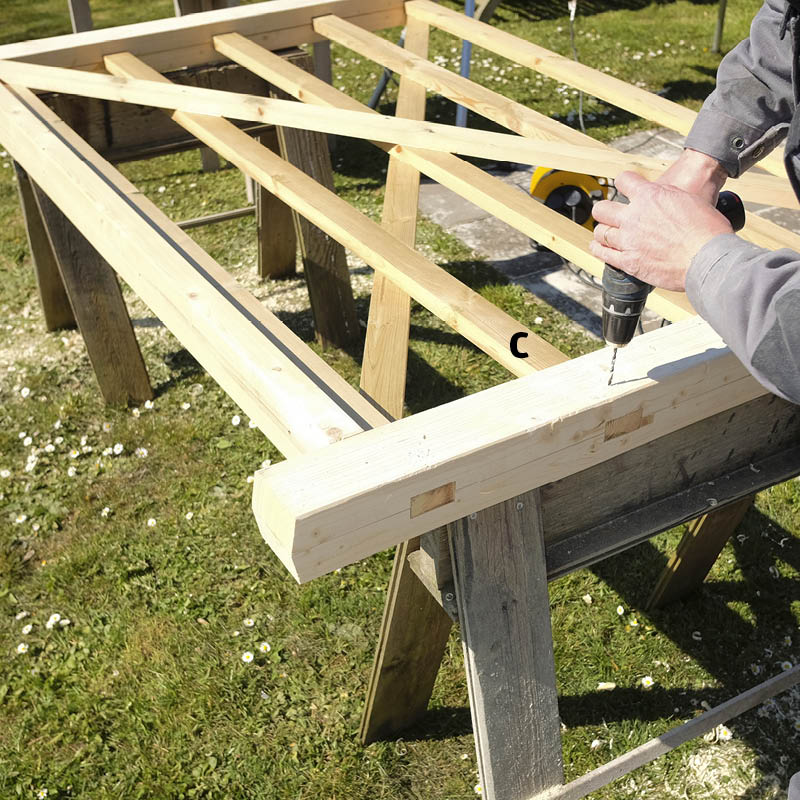 Forbor før du skrur sammen delene for å unngå at listene (C) sprekker. Delene skrus sammen med 5 x 80 mm skruer.