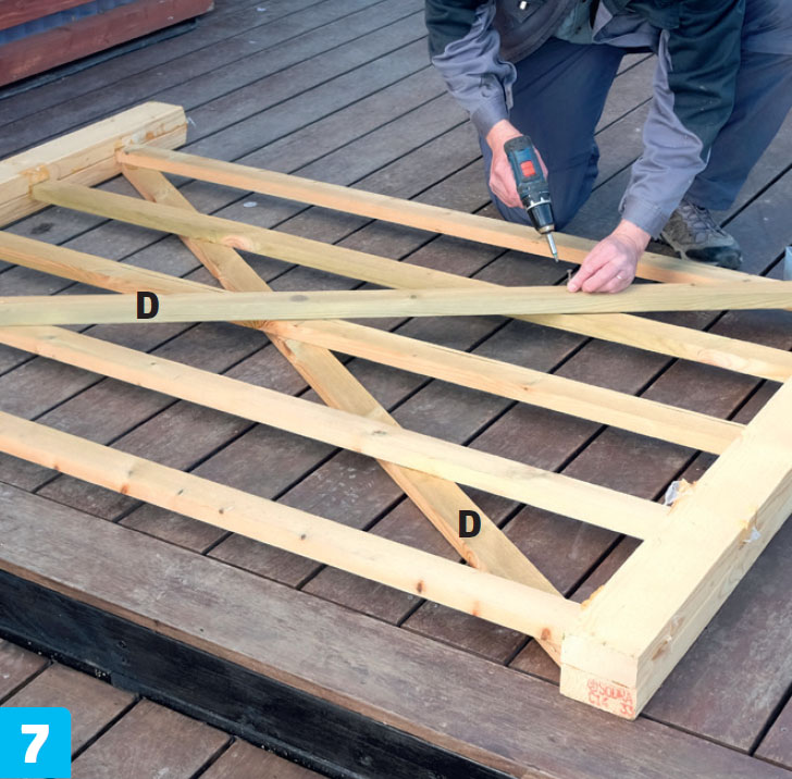 Monter lister (D) diagonalt på begge portene slik at det dannes et kryss. Kontroller at porten er i vinkel før du skrur fast listene.