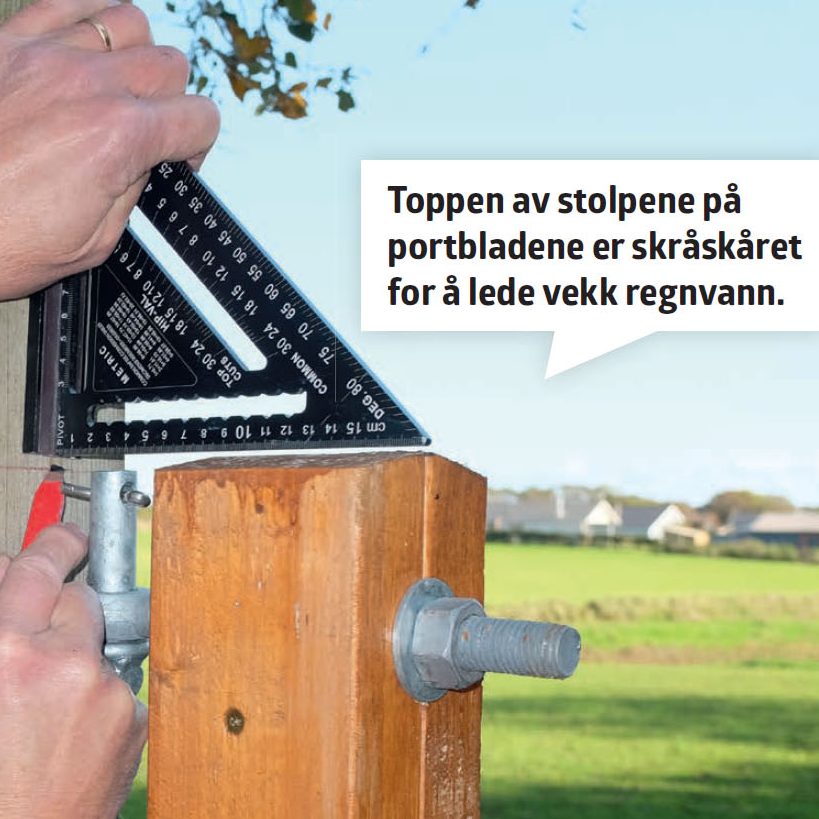 Vi har valgt noen dyre og solide hengsler, som er enkle å montere. Det bores et enkelt hull tilsvarende hengselboltens tykkelse i portstolpen og porten. Deretter spennes hengselet bare fast med en mutter.