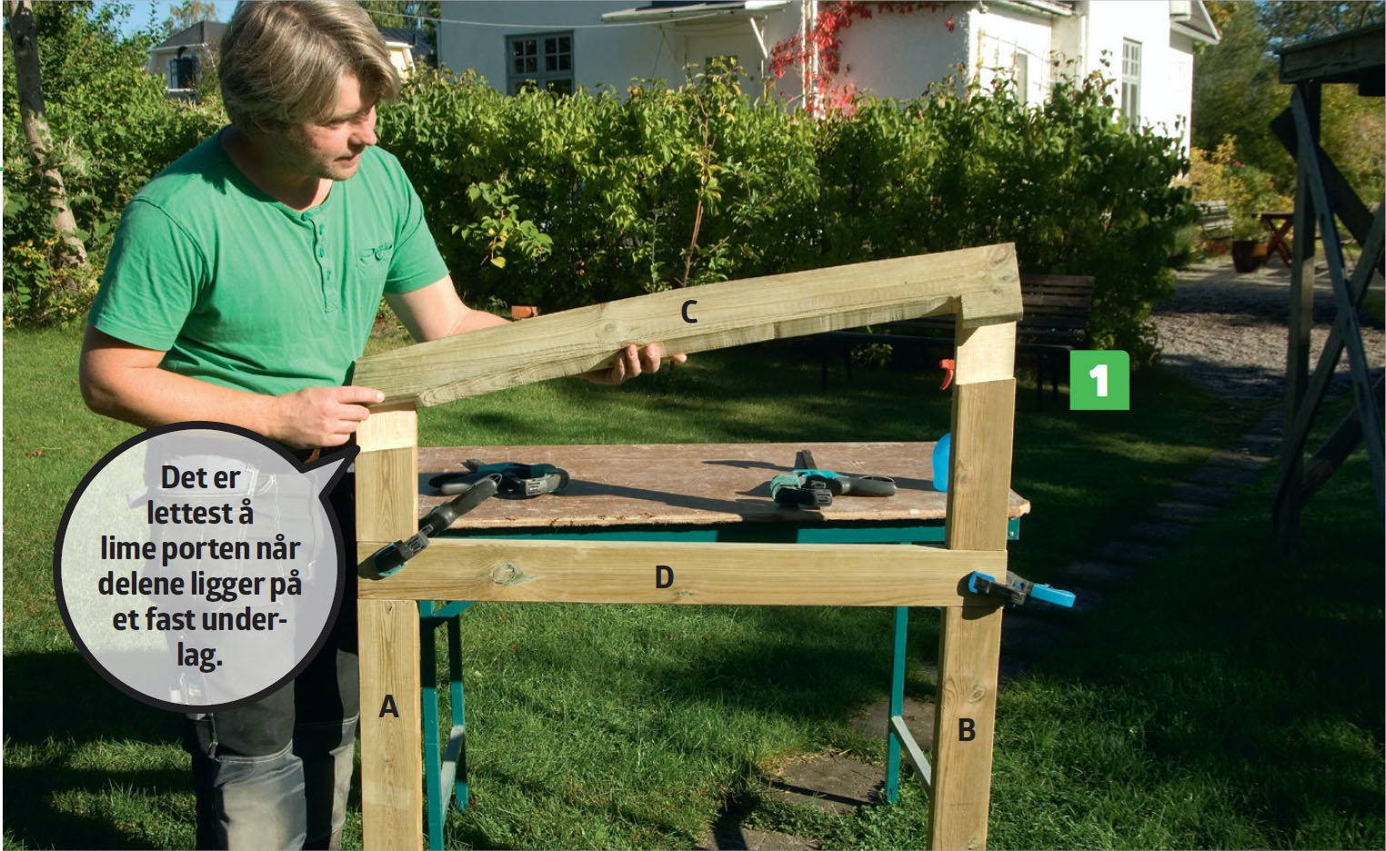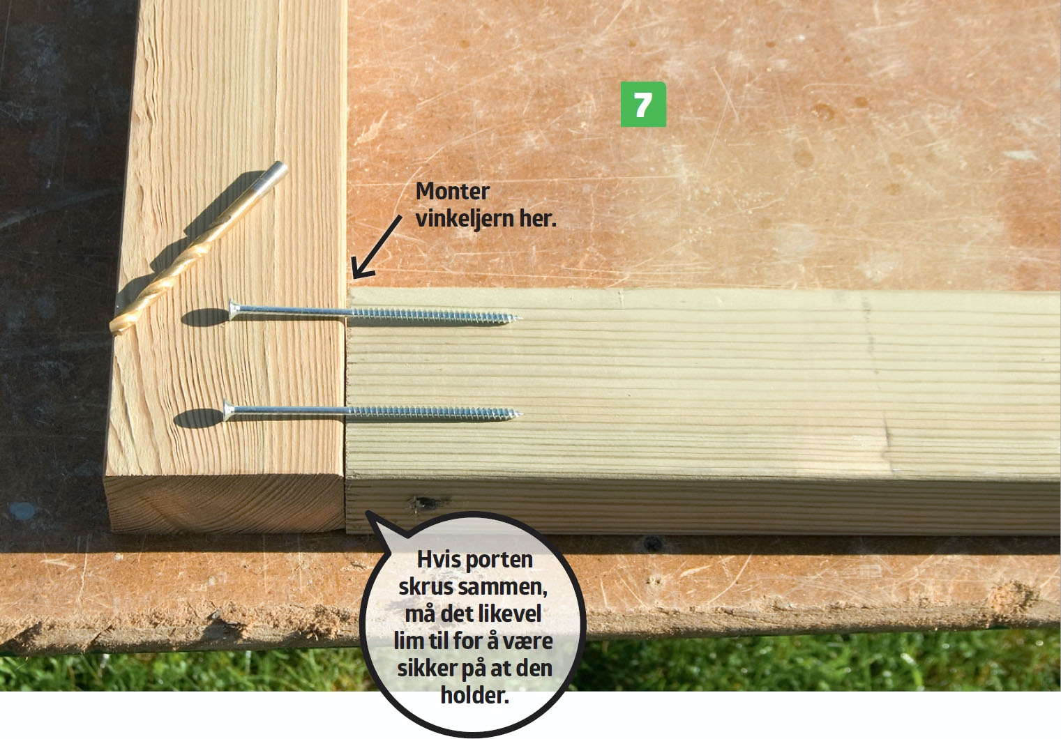 Vi har valgt å bruke polyuretanlim, som er meget sterkt, til å lime sammen porten med. Når limet har tørket, henger du opp porten på portstolpene med galvaniserte hengsler.